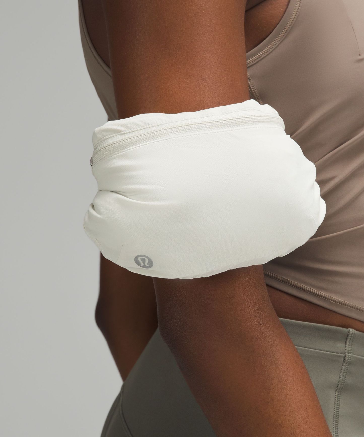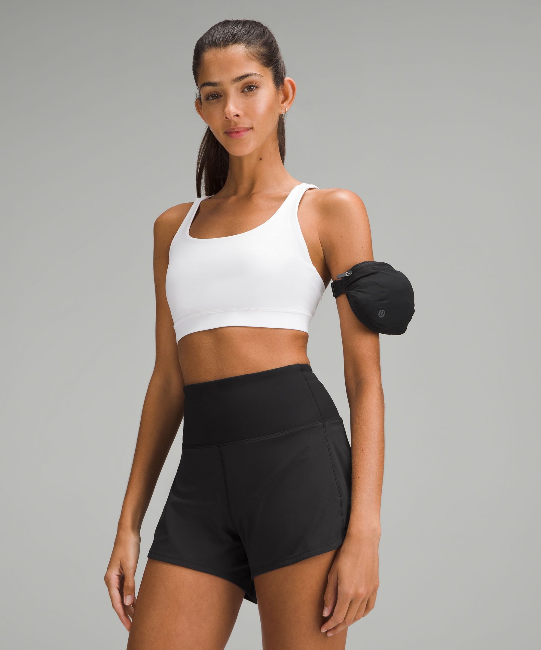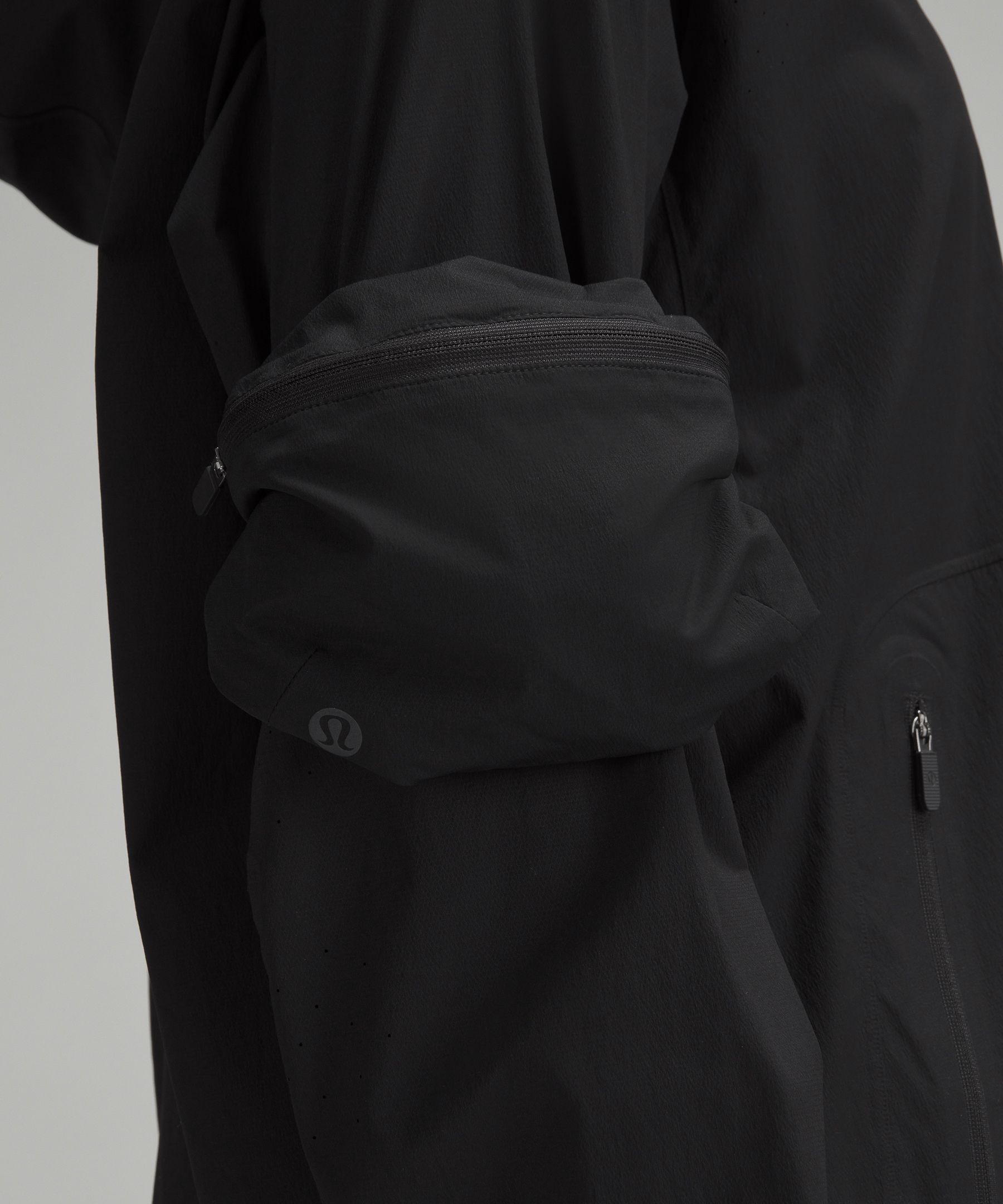 Packs into pouch on sleeve. Unsnap the pouch to wear it around your arm